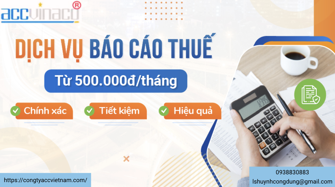 CÔNG TY ACCVINACO cung cấp dịch vụ báo cáo thuế hàng năm trọn gói, đảm bảo xử lý mọi hồ sơ thuế. Xem thêm chi tiết tại dịch vụ kế toán thuế.