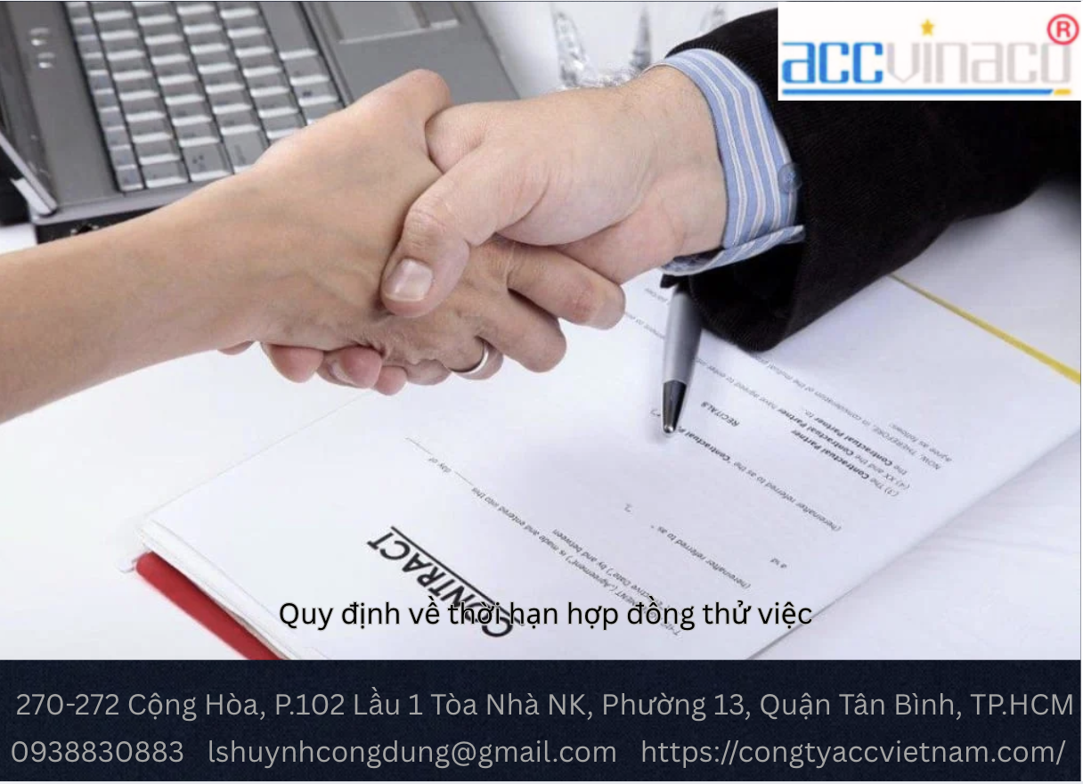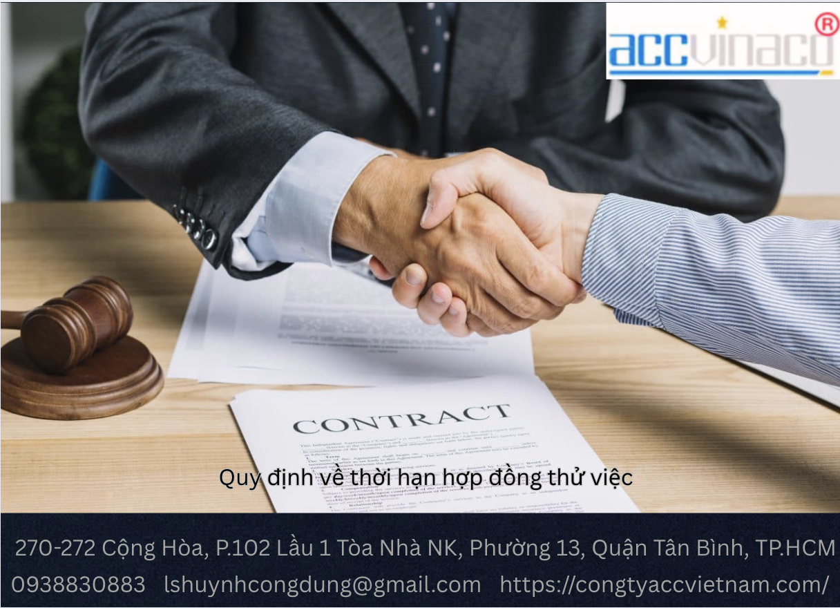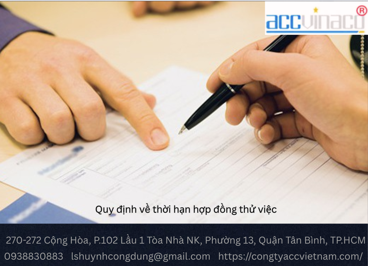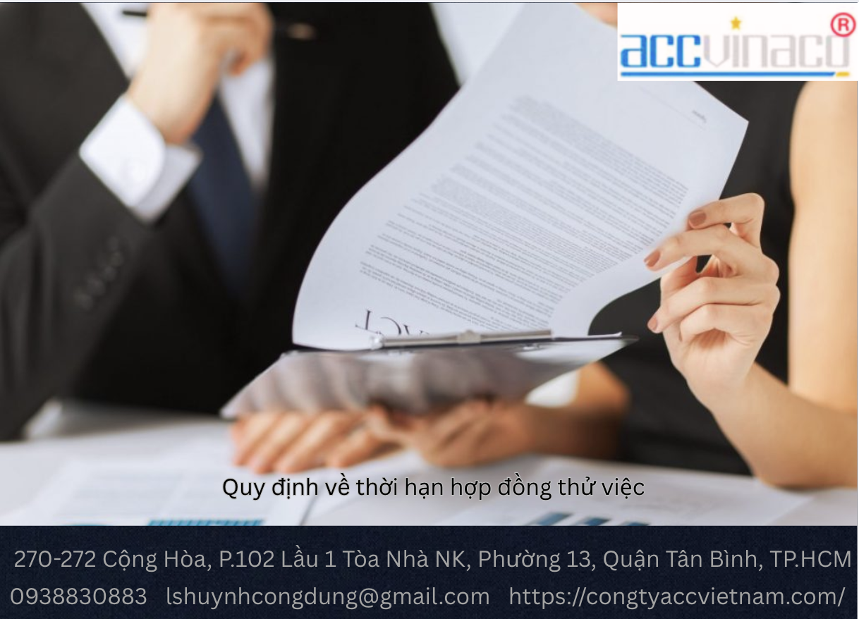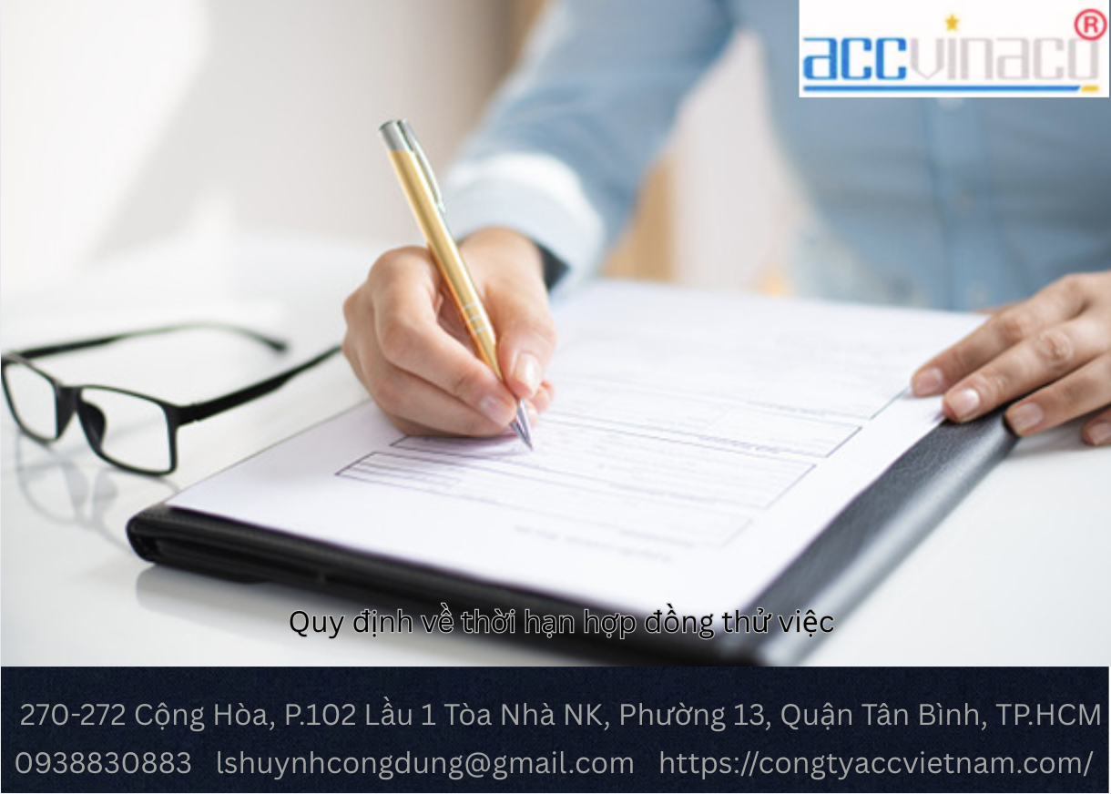 CÔNG TY LUẬT ACC là đơn vị tư vấn pháp lý uy tín tại TP. Hồ Chí Minh, với hơn 10 năm kinh nghiệm hỗ trợ doanh nghiệp và người lao động trong việc soạn thảo hợp đồng thử việc, tư vấn kế toán thuế, và thành lập công ty. Chúng tôi mang đến dịch vụ tư vấn hợp đồng thử việc chuyên nghiệp, nhanh chóng, và đúng quy định.