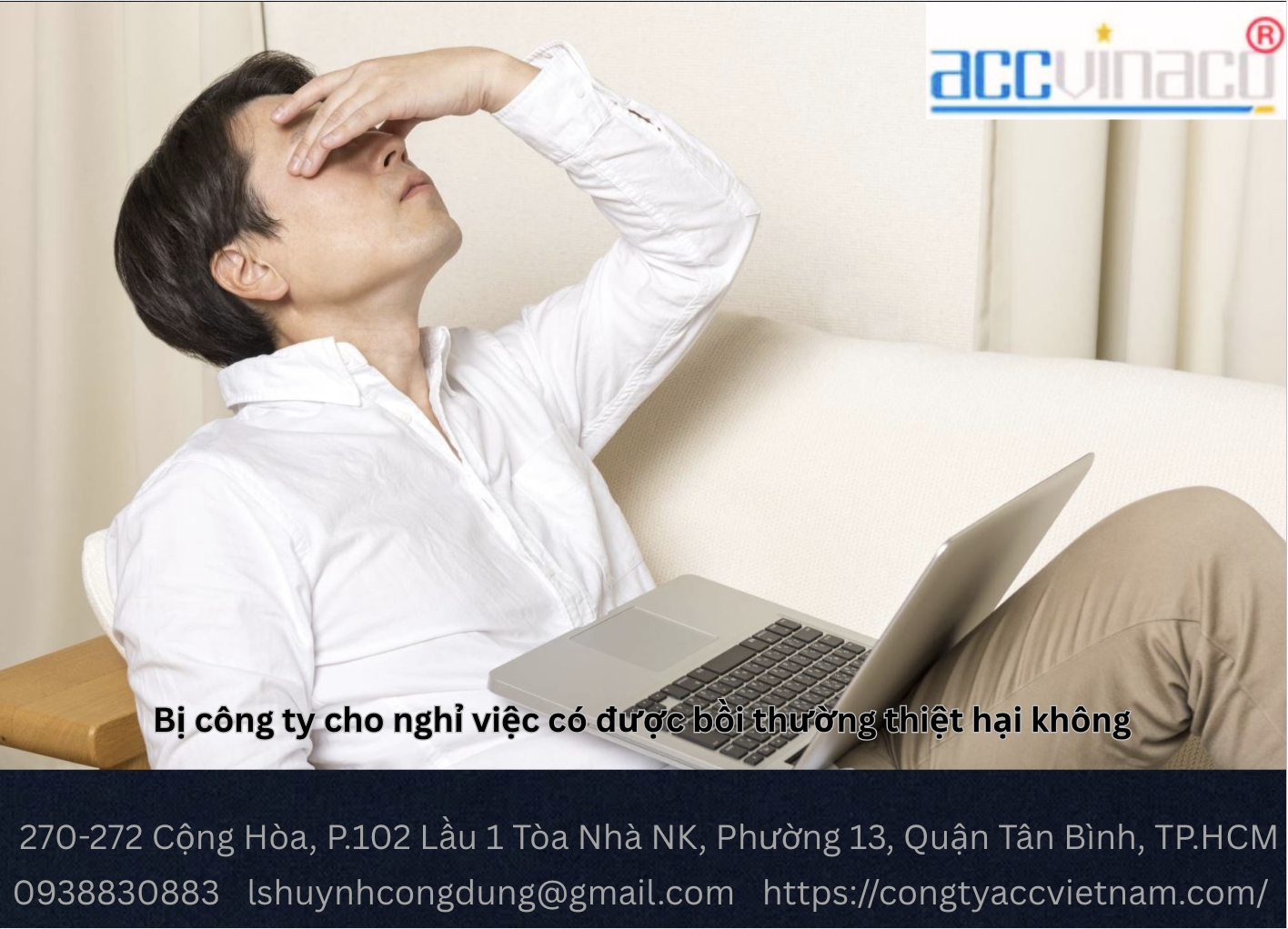 CÔNG TY ACCVINACO giúp người lao động hiểu rõ quyền lợi và yêu cầu bồi thường khi bị cho nghỉ việc. Nếu bạn cần tư vấn pháp lý cho doanh nghiệp, hãy tham khảo dịch vụ thành lập công ty.