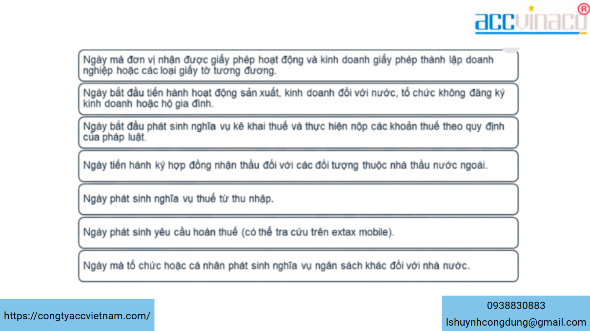 • Ngày bắt đầu phát sinh nghĩa vụ kê khai thuế và thực hiện nộp các khoản thuế theo quy định của pháp luật.