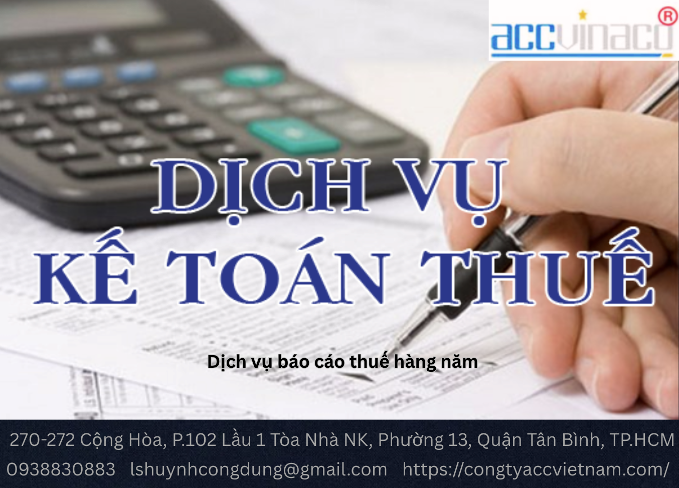 CÔNG TY ACCVINACO cung cấp dịch vụ báo cáo thuế hàng năm trọn gói, đảm bảo xử lý mọi hồ sơ thuế. Xem thêm chi tiết tại dịch vụ kế toán thuế.