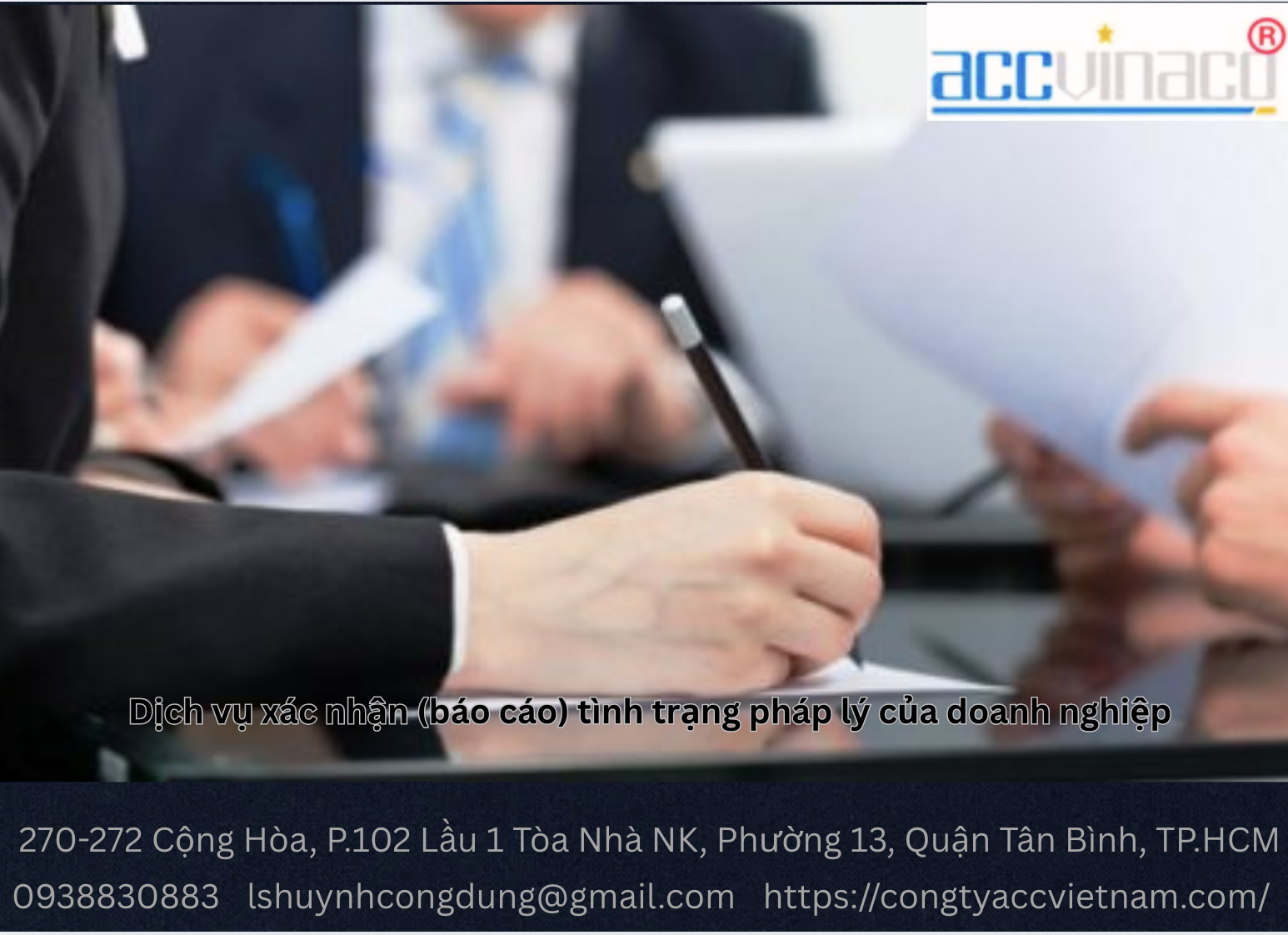 CÔNG TY ACCVINACO hỗ trợ doanh nghiệp xác nhận và báo cáo tình trạng pháp lý, đảm bảo tuân thủ pháp luật. Nếu bạn cần thành lập công ty với tình trạng pháp lý hợp lệ, hãy tham khảo dịch vụ thành lập công ty.
