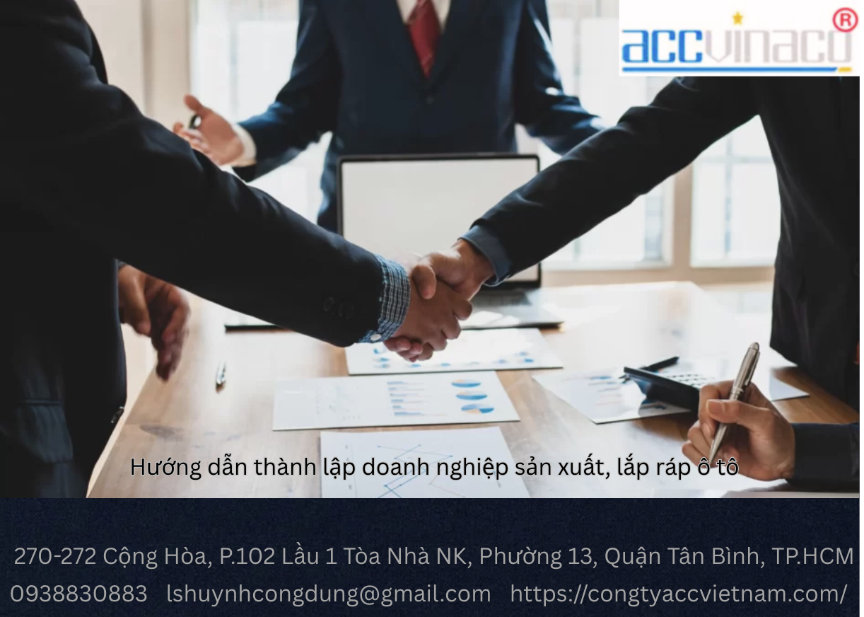 CÔNG TY ACCVINACO là đơn vị tư vấn pháp lý uy tín tại TP. Hồ Chí Minh, với hơn 10 năm kinh nghiệm hỗ trợ doanh nghiệp Việt Nam thành lập công ty, quản lý thuế, và xin giấy phép ngành nghề có điều kiện. Chúng tôi mang đến dịch vụ tư vấn thành lập doanh nghiệp sản xuất, lắp ráp ô tô chuyên nghiệp, nhanh chóng, và đúng quy định.
