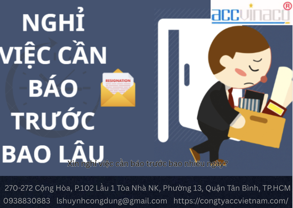 CÔNG TY ACCVINACO là đơn vị tư vấn pháp lý uy tín tại TP. Hồ Chí Minh, với hơn 10 năm kinh nghiệm hỗ trợ người lao động và doanh nghiệp trong việc xin nghỉ việc, giải quyết tranh chấp lao động, và thành lập công ty. Chúng tôi mang đến dịch vụ tư vấn xin nghỉ việc chuyên nghiệp, nhanh chóng, và đúng quy định.